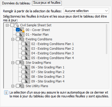 Onglet Sous-jeux et feuilles (boîte de dialogue Tableau des feuilles)