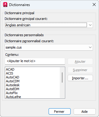 Affiche le nom du dictionnaire personnalisé courant. L'extension .cus est utilisée pour le dictionnaire personnalisé d'AutoCAD.