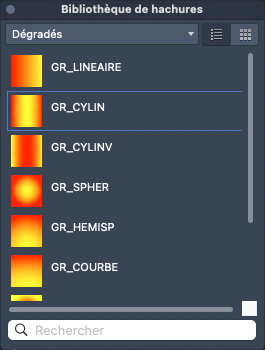 La bibliothèque de hachures peut être affichée sous forme de boîte de dialogue lors de l'utilisation de la boîte de dialogue Hachures et gradient, ou en tant que palette à partir du viseur Hachures ou Gradient.