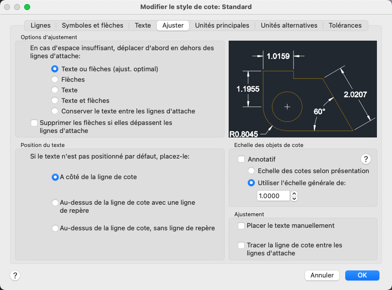 Détermine l'emplacement du texte de cote, des pointes de flèche, des lignes de repère et de la ligne de cote.