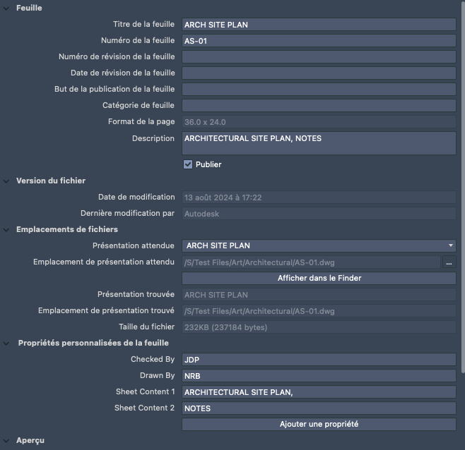 Affiche les informations spécifiques à la feuille sélectionnée (comme le nom et le numéro) et indique si elle sera incluse à la publication. Affiche également les propriétés personnalisées, le cas échéant.