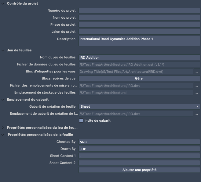 - Affiche le chemin et le nom du fichier gabarit de dessin (DWT) contenant les autres mises en page pour le jeu de feuilles.