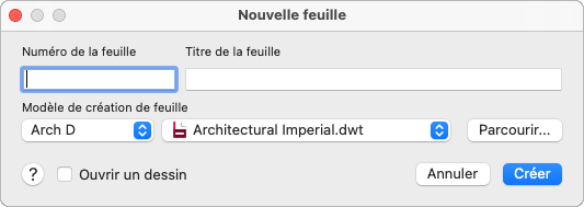Indique le fichier gabarit de dessin (DWT) et la présentation nommée à utiliser lors de la création d’une feuille dans le jeu de feuilles.