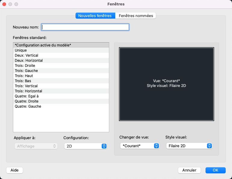 Indique une configuration 2D ou 3D. Si vous sélectionnez l'option 2D, le nouveau fenêtrage est initialement créé avec la vue courante dans toutes les fenêtres. Si vous sélectionnez l'option 3D, un ensemble de vues 3D orthogonales standard est appliqué aux fenêtres de la configuration.