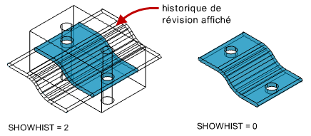 Vous pouvez changer la forme d'un objet composé en modifiant une image filaire mise en surbrillance de ses composants d'origine. Si la propriété Afficher l'historique est définie sur 1 (activé), les images filaires des formes originales (y compris les formes qui ont été retirées) sont affichées de façon atténuée. (La variable système SHOWHIST contrôle également ce paramètre.)