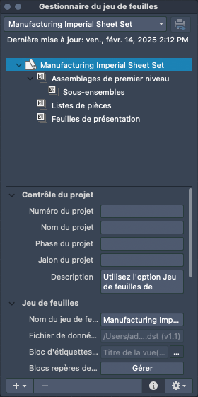 Groupe de fonctions Détails. Affiche les propriétés de l'élément sélectionné dans l'arborescence du projet. Dans le volet inférieur du gestionnaire de jeux de feuilles, faites défiler vers le haut ou vers le bas pour afficher les propriétés disponibles pour l’élément sélectionné.