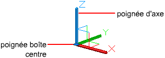 Pour déplacer des objets et des sous-objets 3D, cliquez sur le gizmo 3D et déplacez-le à l'endroit voulu dans l'espace 3D. Cet emplacement (indiqué par le cadre central [ou la poignée de base] du gizmo) définit le point de base du mouvement et modifie temporairement la position du SCU pour le déplacement des objets sélectionnés.