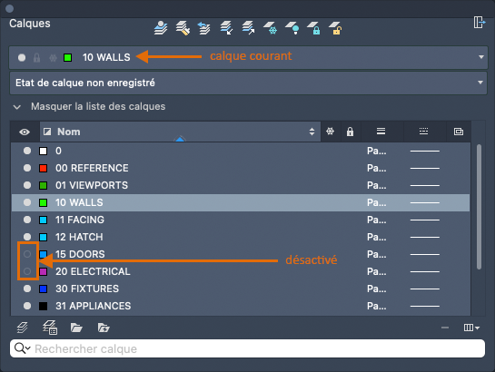 Dans la colonne Visibilité, notez que les icônes circulaires ne sont pas remplies pour deux calques. Ces calques ont été désactivés pour masquer les portes et le câblage électrique du plan d'étage.