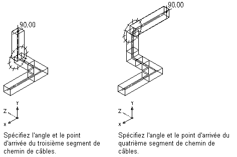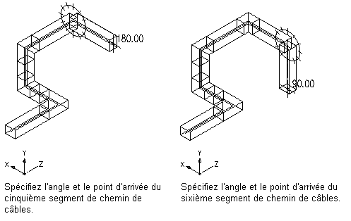 Dessin à des angles et des élévations différents à l'aide de la boussole. L'exemple ci-dessous illustre le dessin d'une longueur de gaine rigide à l'aide de segments alignés sur trois plans SCU différents avec la boussole activée.