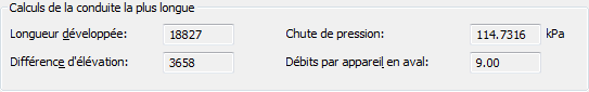 La section Calculs de la conduite la plus longue de la boîte de dialogue Taille de la ligne de plomberie d'alimentation contient les valeurs non modifiables calculées pour la conduite la plus longue.