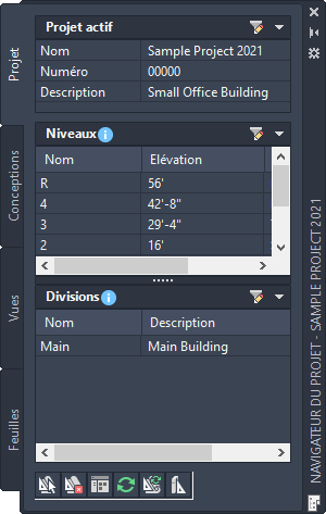 La palette du navigateur de projet est l'emplacement central qui permet de créer, de modifier et d'ouvrir les fichiers de projet Jeu d’outils AutoCAD MEP 2026. Cette palette est généralement ouverte dans l'espace de travail pendant que vous travaillez sur un projet. Pour plus d'informations, voir .