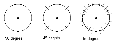 L'affectation de repères basés sur un incrément d'accrochage spécifique s'utilise pour la plupart des opérations de dessin. Par exemple, si l'incrément d'accrochage est défini sur 45 degrés, définissez les repères sur 45 ou 90 degrés. En revanche, si l'incrément d'accrochage est défini sur une valeur inférieure à 45 degrés (par exemple, 15 degrés), définissez les repères sur 30, 45 ou 90 degrés de manière à éviter d'encombrer l'affichage de la boussole affichage.
