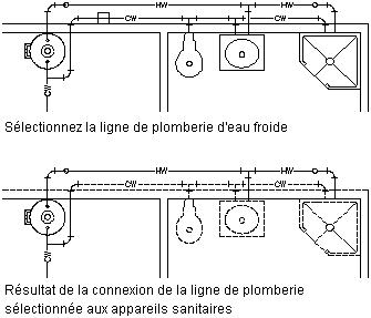 Toutes les lignes de plomberie, tous les raccords et tous les appareils reliés ou en aval par rapport à la ligne de plomberie sont sélectionnés, comme indiqué dans l'illustration suivante.