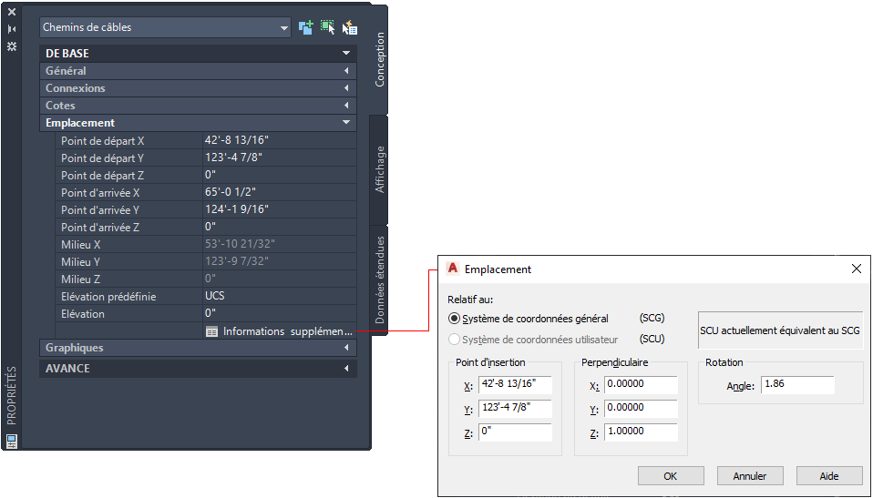 Vous pouvez afficher les informations d'emplacement et modifier les points d'insertion X, Y et Z en fonction du système de coordonnées et de l'angle de rotation actuels du composant. Vous pouvez spécifier les valeurs d'élévation, de point de départ, de milieu et de point d'arrivée. Les détails d'emplacement sont disponibles dans la boîte de dialogue des propriétés pour les gaines ou les pièces à vues multiples. Pour les autres composants comme les chemin de câbles, tel qu'indiqué ci-dessous, cliquez sur