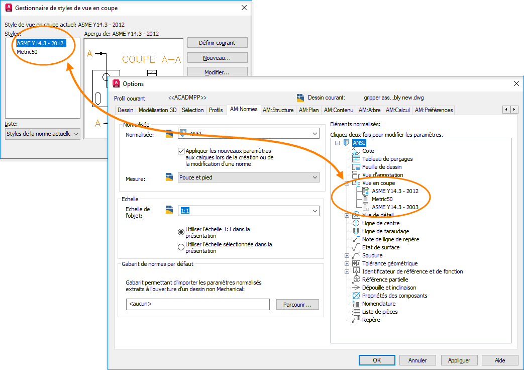 . Seuls les styles de vue en coupe du Jeu d’outils AutoCAD Mechanical peuvent hériter des paramètres du texte et de la ligne de repère des paramètres principaux de la norme de dessin.