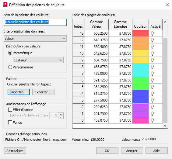 À l'aide de jeu d’outils AutoCAD Raster Design, vous pouvez afficher une surface de terrain DEM avec codage couleur par élévation, degré d'inclinaison ou aspect (direction d'inclinaison). Dans la boîte de dialogue Définition des palettes de couleurs, spécifiez les attributs à afficher, puis définissez le nombre de plages de valeurs, la couleur de chaque plage, ainsi que la stratégie de distribution des plages sur l’étendue des valeurs de données.