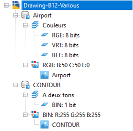Comme l'illustre la figure, chaque définition de données comprend un ou plusieurs groupes de bandes (exemple : Couleurs ou A deux tons) et des bandes au niveau inférieur. Au même niveau que les groupes de bandes, se trouvent les palettes des couleurs (exemple : RVB et BIN). En dessous des palettes de couleurs se trouvent les images insérées correspondantes. La principale différence entre la vue Insertions d'images et la vue Données d'images repose sur l'emplacement de l'image insérée dans l'arborescence.