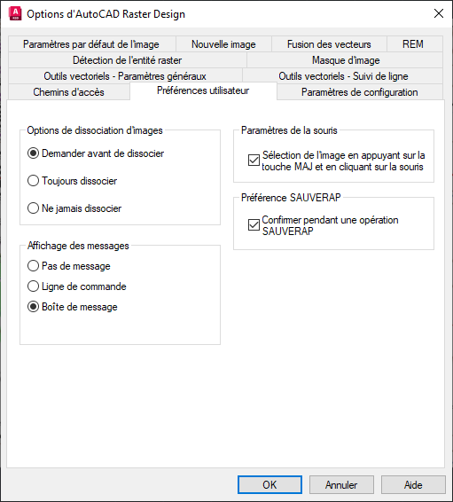 La boîte de dialogue Options d'AutoCAD Raster Design comprend les onglets suivants. Pour plus d'informations sur ces paramètres, cliquez sur l'onglet, puis sur Aide.