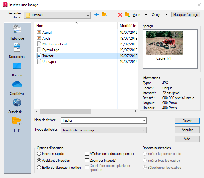 Lorsque vous insérez une image à l'aide de la commande Insérer du jeu d’outils AutoCAD Raster Design, vous pouvez afficher un aperçu de l'image et des informations telles que le type de fichier, l'intensité de la couleur et la densité. La colonne des dossiers, à gauche de la boîte de dialogue Insérer une image, est appelée liste des emplacements. Elle contient des raccourcis vers les dossiers locaux, tels que le bureau ou les documents.