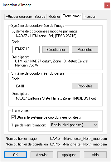 Il permet de transformer le système de coordonnées d'une image afin qu'il corresponde au système utilisé dans un fichier de dessin. Dans la plupart des cas, le système sélectionne automatiquement le code adéquat et les valeurs associées. Cet onglet s'affiche si jeu d’outils AutoCAD Raster Design est installé sur une application de cartographie Autodesk telle que le jeu d’outils AutoCAD Map 3D ou AutoCAD Land Desktop, ou si un dessin compatible avec le système de coordonnées SIG est ouvert.