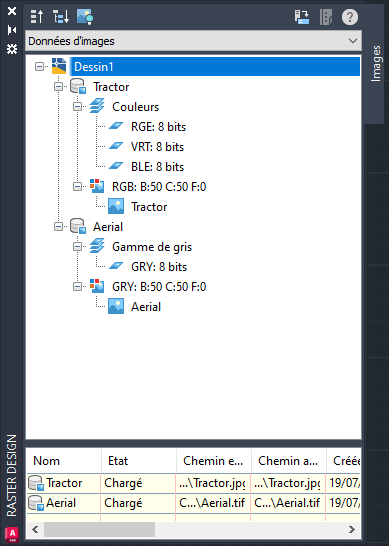 La fenêtre d’outils Gestionnaire des images affiche la structure des données d’images associées à un dessin. Les options de cette boîte de dialogue permettent de manipuler les fichiers image, de modifier l'ordre d'affichage des images ou leur chemin d'accès actif, de modifier des palettes de couleurs et d'exporter des images à d'autres emplacements.