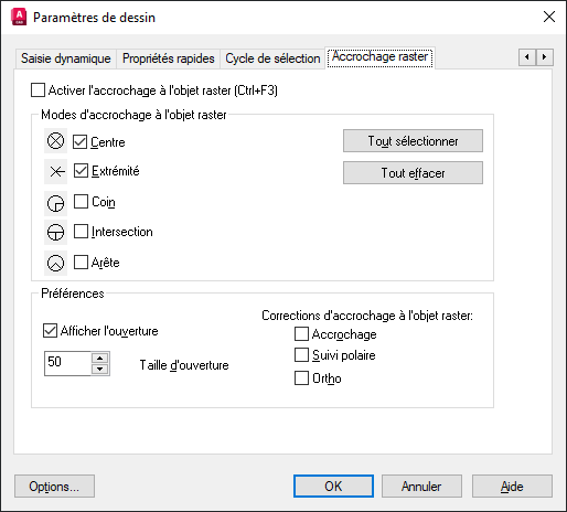Lorsque l'accrochage raster est activé, une fenêtre d'accrochage s'affiche au niveau du curseur AutoCAD. Cette fenêtre affiche des réticules sur les points sur lesquels il est possible d'effectuer un accrochage. Vous pouvez sélectionner un ou plusieurs modes d'accrochage pour contrôler si le curseur s'accroche aux extrémités, angles et autres points.