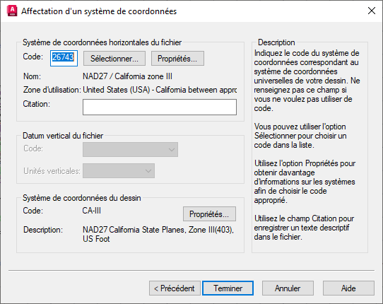 Code utilisé par le jeu d’outils AutoCAD Map 3D pour identifier le système de coordonnées du dessin.