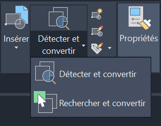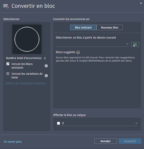 RECHERCHERBLOC : remplace CONVERTIRBLOC. Affiche la boîte de dialogue Convertir, qui fournit des options permettant de convertir les entités sélectionnées et les occurrences identiques en blocs.