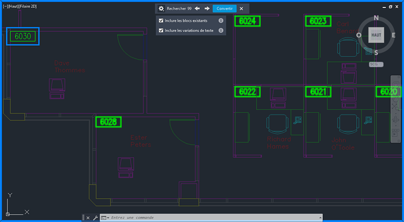 Dans cette version, Rechercher et convertir permet également de rechercher les variations de texte à convertir en attributs de bloc. Cette nouvelle fonctionnalité est utile pour classer des types de texte répétitifs mais variables, tels que les numéros de chambres d’hôtel ou les noms de chambres.