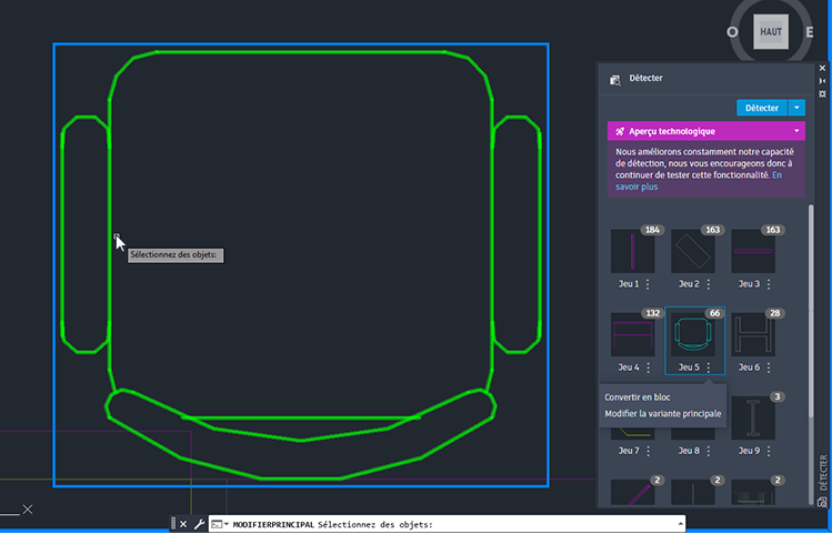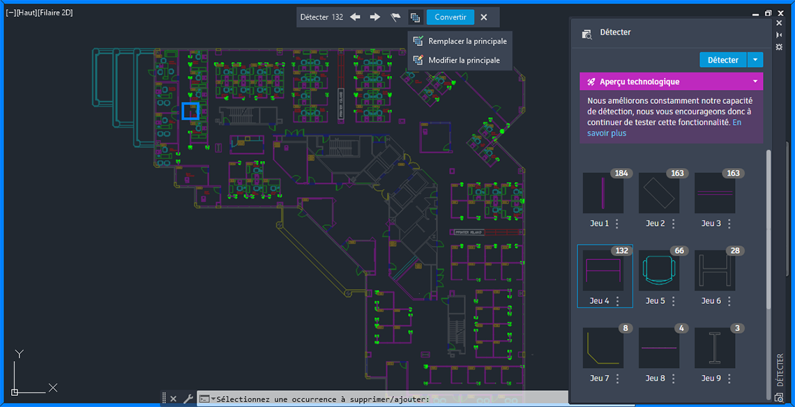 La commande DETECTERBLOC, anciennement connue sous le nom de DETECTION, utilise Autodesk AI pour identifier et regrouper les objets similaires dans un dessin afin de faciliter la conversion des blocs.
