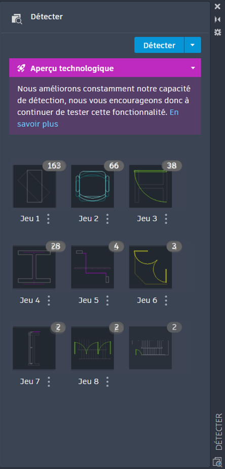 Une fois que vous avez exécuté DETECTERBLOC, la palette Détecter affiche tous les ensembles détectés dans une nouvelle miniature.