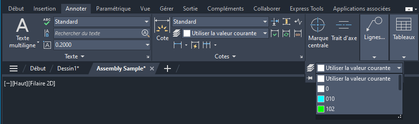 - Sur le ruban, onglet Annoter > volet Traits d’axe, à l’aide du contrôle Calque.