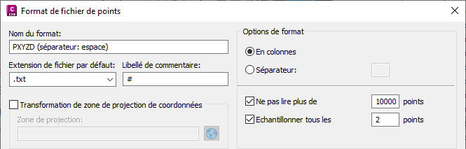 Figure 1 : Paramètres pour le filtrage du fichier de point