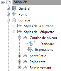 Modifiez les paramètres d'étiquette au niveau du dessin, de l'objet (tel que Surface) et du type de style d'étiquette (tel que Courbe de niveau).