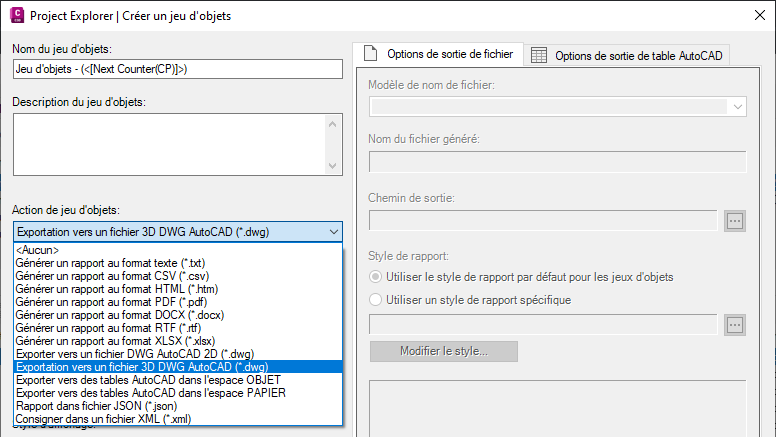 - L’option Consigner dans un fichier XML a été ajoutée à la liste déroulante des actions de jeu d’objets dans la boîte de dialogue Créer un jeu d’objets.