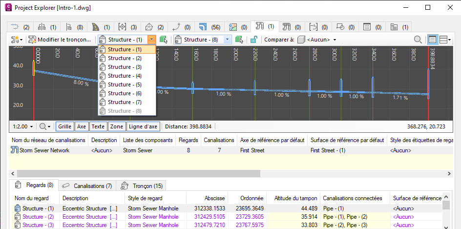 - Amélioration de la possibilité de faire défiler facilement de longues listes de structures lors de la sélection d’une structure de début et de fin pour le dessin de profil en long dans l’onglet Réseaux de canalisations.