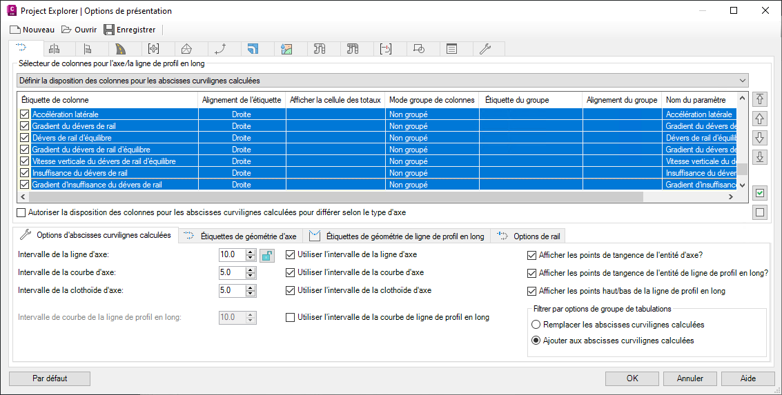 - Les valeurs de dévers de rail suivantes ont été ajoutées à la liste des abscisses curvilignes calculées, et sont disponibles dans les rapports et les tableaux.