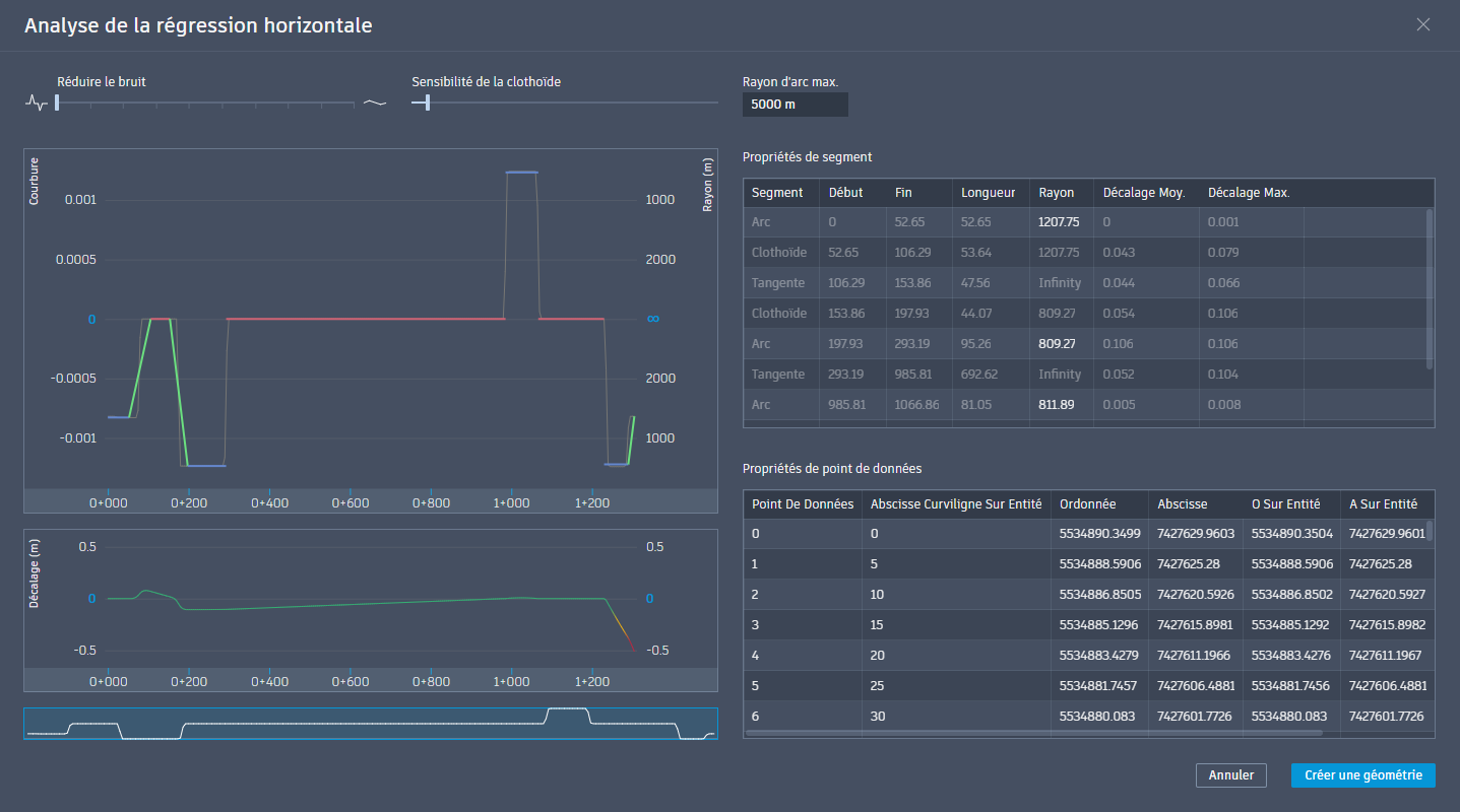 Pour générer des axes avec l’analyse de régression horizontale, sélectionnez un ou deux jeux de données linéaires (points COGO, lignes caractéristiques ou polylignes 2D/3D). Une fois la vue Analyse de régression horizontale vous propose une solution, vous pouvez ajuster les seuils pour affiner les données de l’axe final à créer. En savoir plus.