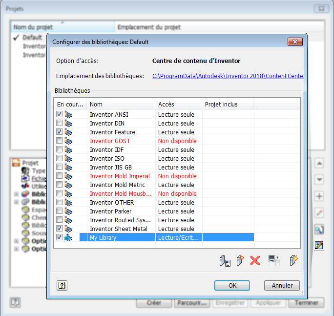 Si l'emplacement du groupe de travail ou de la bibliothèque est un sous-dossier d'un autre emplacement défini, Inventor met en surbrillance la trajectoire différente. Vous pouvez enregistrer le fichier projet. Il s'agit d'un avertissement indiquant que l'emplacement ne produit pas la structure de fichier la plus efficace.