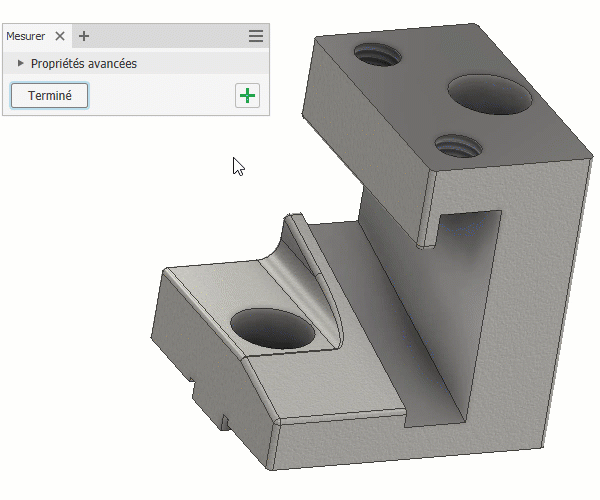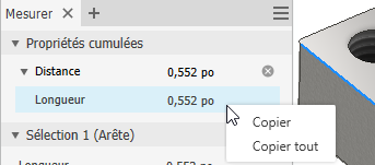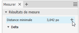 Effectuez autant de sélections que nécessaire dans la fenêtre graphique, puis cliquez sur le signe Plus situé à côté du type de mesure dans le groupe de fonctions Mesurer afin d’ajouter des valeurs à un groupe de valeurs cumulées. Les valeurs sont affichées dans le groupe de valeurs cumulées spécifique au type de mesure. Par exemple, un rayon est ajouté au groupe Distance et un angle est ajouté au groupe Angle, sous Propriétés cumulées.