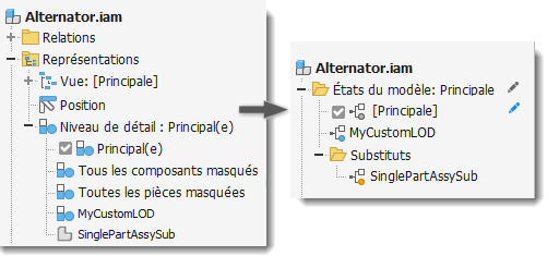 Des représentations de niveau de détail ont été introduites pour améliorer la capacité et les performances sur les ordinateurs plus lents et disposant de moins de mémoire. Dans Inventor 2022 ou toute version ultérieure, les ensembles contenant des niveaux de détail et des substituts sont convertis en états du modèle.