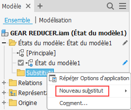 Pour créer un état du modèle de substitution : développez le dossier États du modèle, cliquez avec le bouton droit de la souris sur Substituts, choisissez Nouveau substitut, puis Dériver l’ensemble, Simplifier ou Sélectionner le fichier pièce.