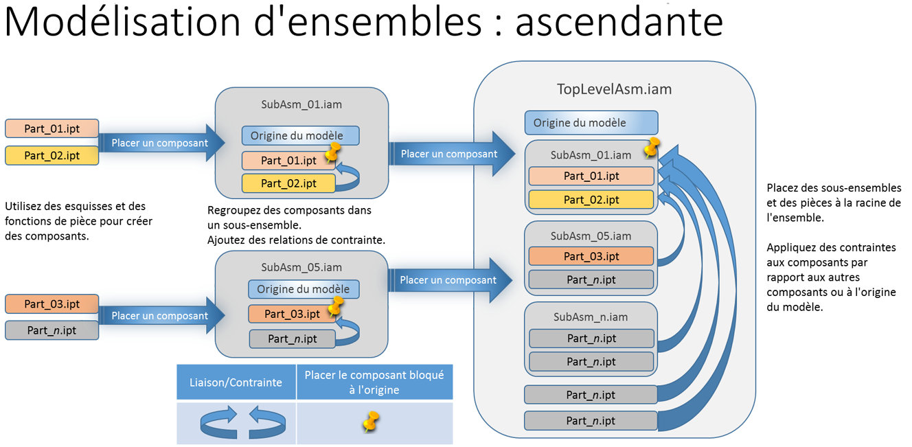 Il est d'usage de combiner des techniques pour répondre aux besoins de vos produits et de votre conception. Par exemple, vous pouvez utiliser la modélisation descendante pour la conception et la construction d'une ossature, puis la modélisation ascendante pour placer et contraindre des composants d'une bibliothèque. Les diagrammes et brèves descriptions suivants fournissent des concepts de modélisation qui vous permettent de tester différentes variantes de la conception, afin de déterminer laquelle est la plus adaptée à vos besoins.