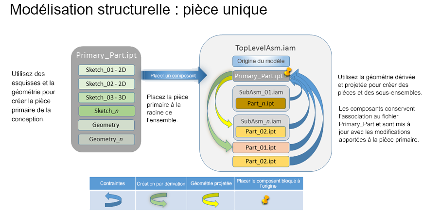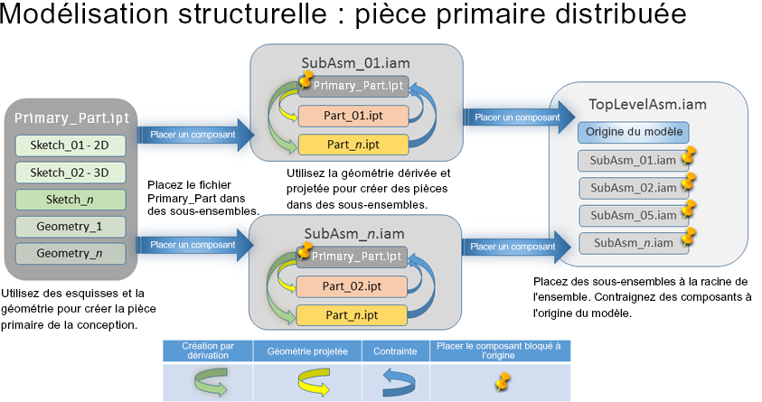 L’élément principal distribué utilise une seule pièce principale, qui comprend des esquisses et une géométrie pour définir l’ensemble final. La pièce principale est référencée dans les divers sous-ensembles et pièces, selon les besoins. Elle contrôle la disposition globale. L’ensemble et les sous-ensembles sont définis ou placés par rapport à elle. Chaque sous-ensemble possède sa propre structure et contient une partie de la conception. Les structures de niveau supérieur sont utilisées pour la mise en forme globale ou pour mettre en place les mécanismes de l'ensemble, tandis que les structure de niveau inférieur servent au contrôle de la géométrie des pièces.