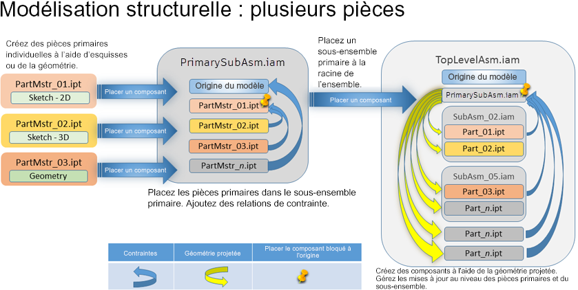 Le processus à plusieurs niveaux utilise des pièces principales individuelles constituées d’esquisses qui représentent l’ensemble final. Les pièces principales sont placées et contraintes dans un sous-ensemble principal. Ce dernier est placé dans la racine de l’ensemble. Les composants 3D individuels y sont modélisés à l’aide d’une géométrie projetée à partir du sous-ensemble principal et de ses pièces principales. Les composants 3D peuvent être inclus dans les sous-ensembles logiques ou à part, en fonction des exigences de la conception.
