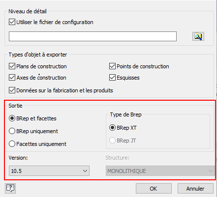 - BRep JT : autoXtBrep = false. Remarque : le type de BRep JT requiert la version 10.2 ou antérieure.