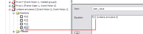 Exemple | 10+cos(P[1] (Pivot: 1) - PI/6)+20*abs(P[3] (Rotule: 2)) Où P[1] (Pivot:1) est la position du premier degré de liberté de la liaison Pivot:1. P[3] (Rotule:2) est la position du troisième degré de liberté de la liaison Rotule:2. Remarque : vous pouvez ajouter une variable en cliquant dans la case à gauche de la variable dans le navigateur du graphique de sortie. |