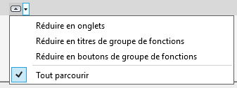 Pour modifier l'affichage du ruban, cliquez sur la flèche située à droite de la barre d'onglets et sélectionnez une option. Vous pouvez réduire les onglets ou les titres des groupes de fonctions. Vous pouvez parcourir les options du ruban en cliquant sur l'icône au lieu de la flèche.