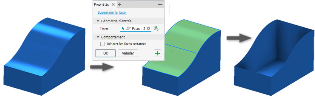 (Facultatif) Lorsque vous supprimez une face, sélectionnez l’option Réparer les faces restantes pour corriger les espacements en prolongeant les faces adjacentes jusqu’à ce qu’elles se croisent.