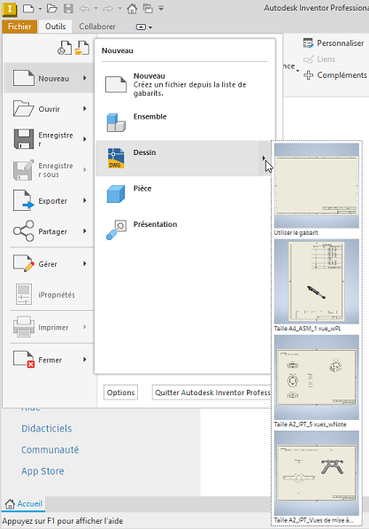 Dans l’icône déroulante Nouveau, placez le curseur sur Dessin pour afficher les options de format de feuille et de gabarit.
